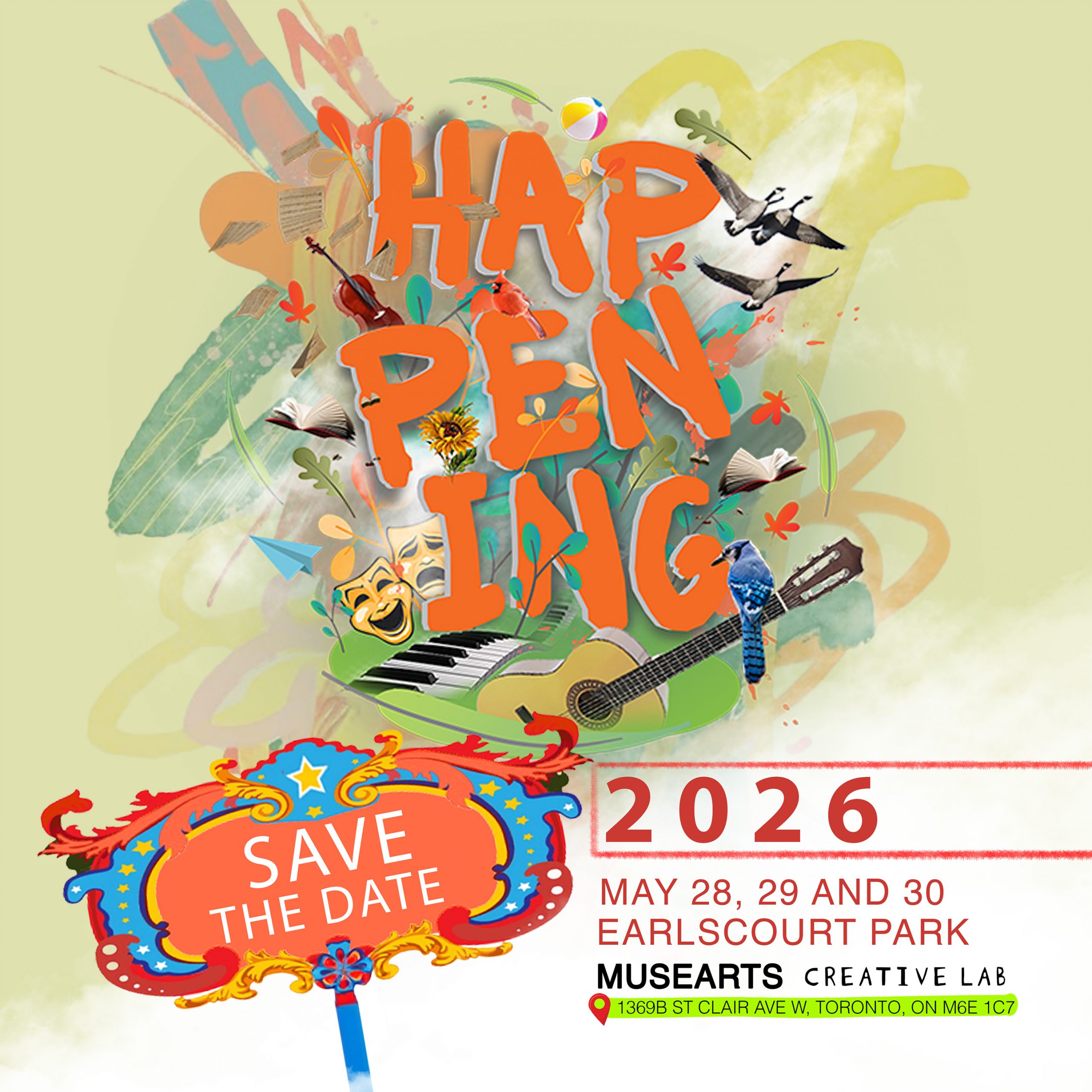 Happening Community Activation events take place from May 15th – May 24th, and our #HAPPENING Festival May 29th to May 31, 2025. All events are taking place at MUSE Arts Creative Lab (1369B St Clair Ave West, Earlscourt Park – St Clair Ave West and Caledonia Road entrance).